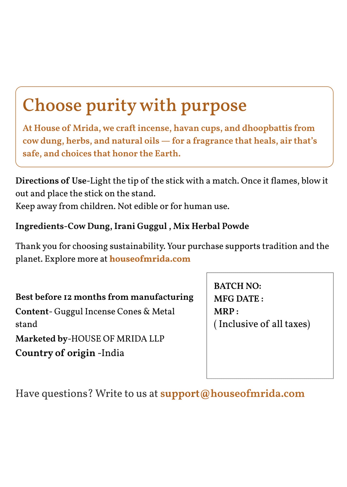 Our cones are 100% charcoal-free, eco-friendly, and compostable. We use non-toxic and alcohol free fragrances. These cones are handcrafted with love using cow dung, natural herbs, and the pure Guggul essence.