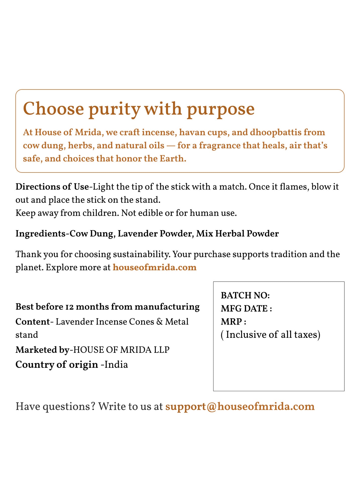 Our incense cones are made with real, grounding ingredients — cow dung, natural herbs, and pure lavender essence. Lavender fragrance is ideal for small rituals, quick meditation, study breaks, stress release, or for shifting the energy of a space.