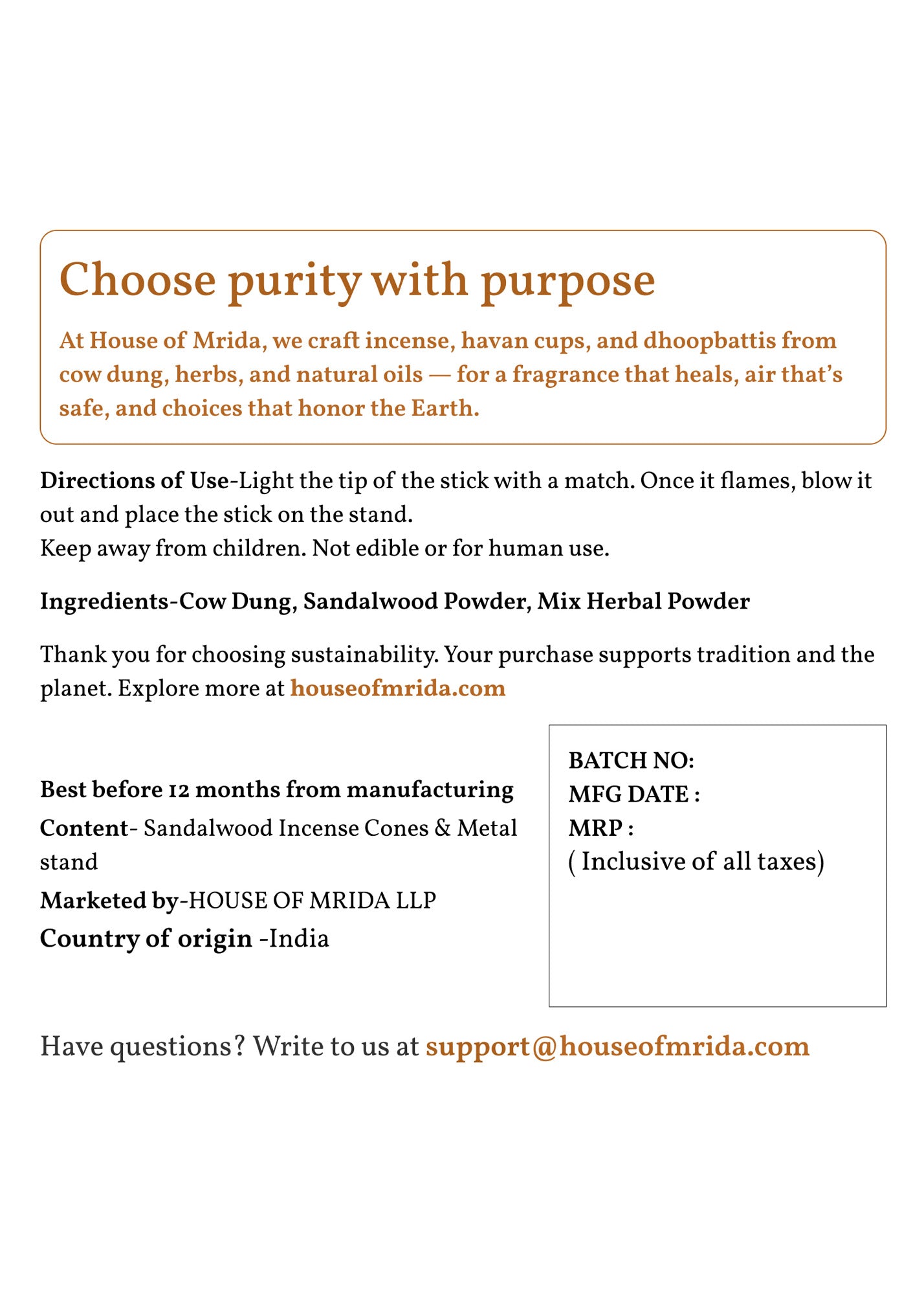The moment you light our House of Mrida Sandalwood (Chandan) cone, the space fills with warmth and calm. The soft, woody fragrance of sandalwood gently relaxes your mind and makes the environment feel lighter and more balanced. These Sandalwood incense cones are made for those who value a pure, calming space—where the energy feels real and gentle.
